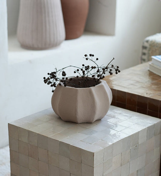 כדים מחרס טבעי שמעניקים לחלל אווירה חמה, טבעית ועשירה בטקסטורה.