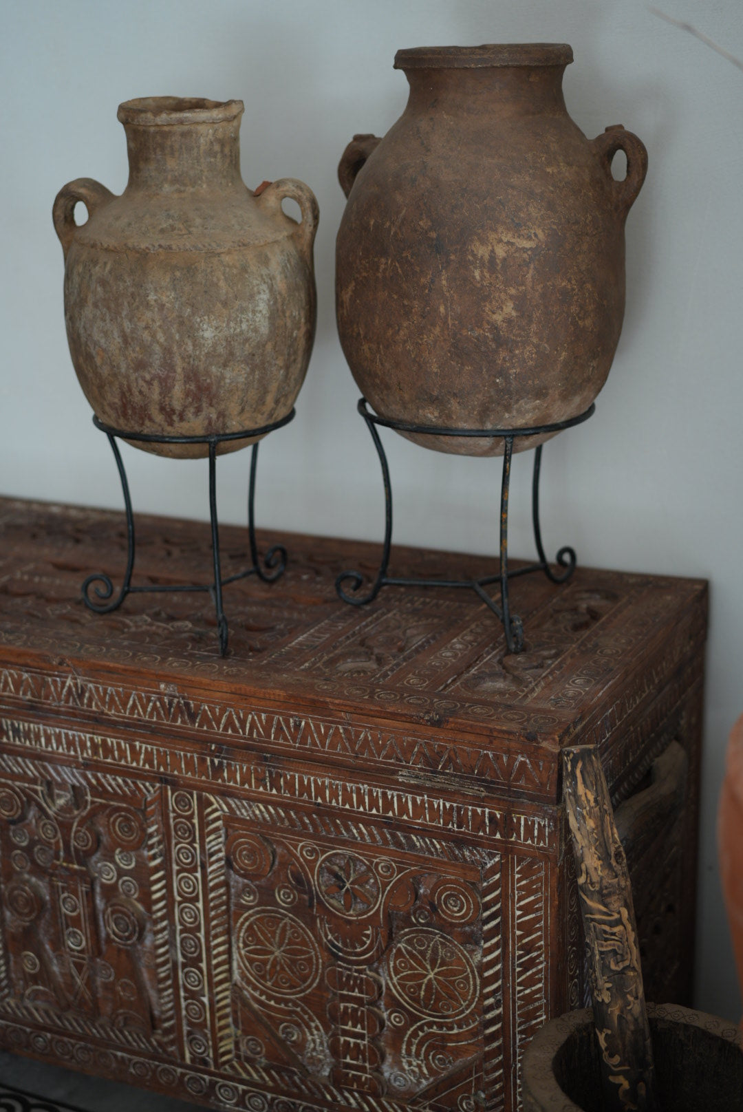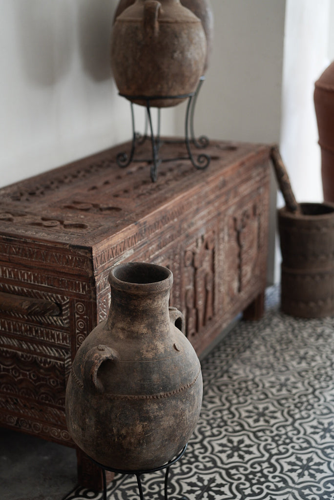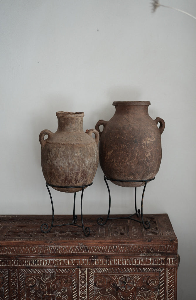 כד חרס וינטאג׳ על סטנד עשויה ברזל