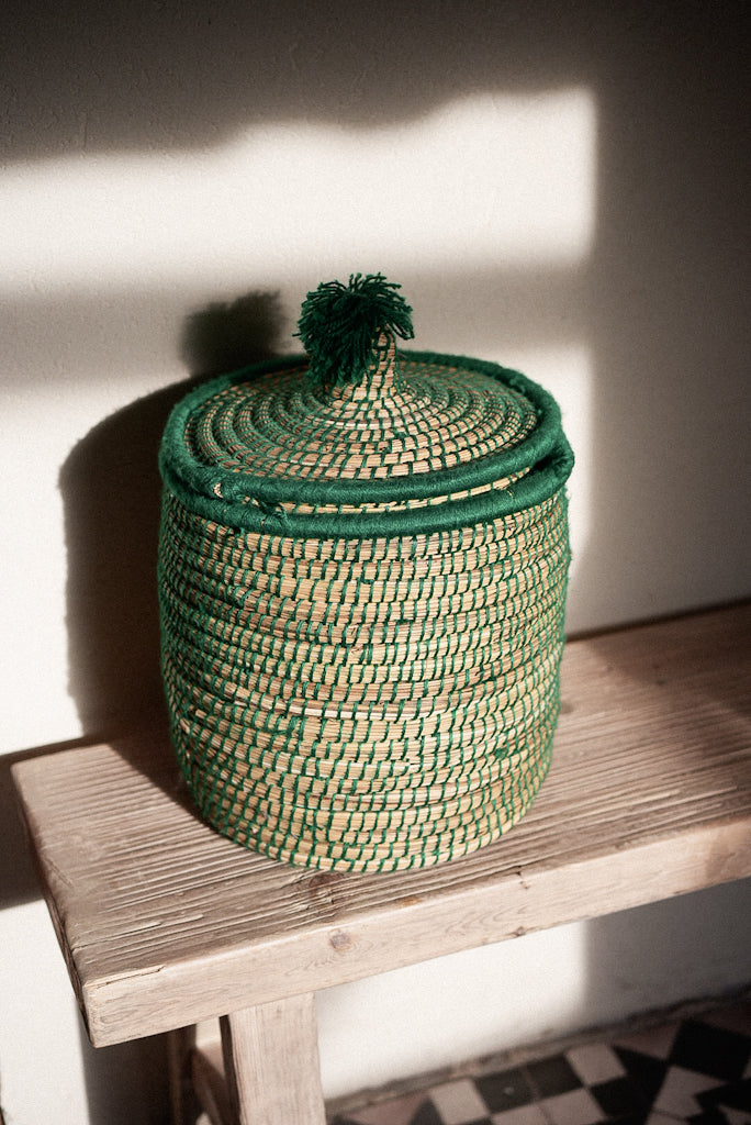 קופסת קש עם מכסה, רקומה בחוט ירוק עם פונפון